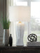 Details Made of polyresin with drum hardback fabric shade, Antiqued gray finish, 3-way switch, 1 E26 socket, type A bulb recommended (not included); 150 watts max or LED equivalent; UL Listed, Minor assembly required; simply attach preassembled shade to lamp base