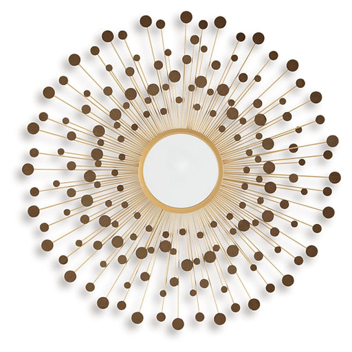 Signature Design by Ashley®This accent mirror makes a bold statement in contemporary and industrial spaces. Framed with sunburst-style metal fretwork and finished in a luxe b...