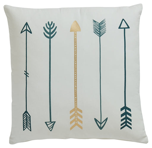 Signature Design by Ashley®Add a distinctive piece of decor to your room with this accent pillow. Adorned with a pattern of arrows in teal, white and metallic goldtone, this ...