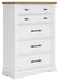 | Details | B844B5: Includes panel headboard, storage footboard, rails and roll slats, Footboard made with hardwood solids, MDF substrates and butcher block oak veneer, Headboard and rails made with hardwood solids and MDF substrates, White finish, Headboard with inset black metal barn sash, 2 drawers in footboard with fully finished interior, dovetail construction and ball-bearing side glides, Pulls with matte black finish, Bed does not require a foundation/box spring, Mattress available, sold separately, Assembly required, B844B1: Includes dresser and mirror, Made with hardwood solids, MDF substrates and butcher block oak veneer, Dresser with 2-tone finish (white finish; butcher block oak veneer with natural finish), Pulls with matte black finish, 10 spacious drawers with fully finished interiors (top drawers felt lined), dovetail construction and ball-bearing side glides , Drawers with inset picture fronts, Mirror attaches to back of dresser, B844-46: Made with hardwood solids, MDF substrates and butcher block oak veneer, 2-tone finish (white finish; butcher block oak veneer with natural finish), Pulls with matte black finish, 5 spacious drawers with fully finished interiors (top drawers felt lined), dovetail construction and ball-bearing side glides, Drawers with inset picture frame fronts, B844-93: Made with hardwood solids, MDF substrates and butcher block oak veneer, 2-tone finish (white finish; butcher block oak veneer with natural finish), Pulls with matte black finish, 3 spacious drawers with fully finished interiors (top drawers felt lined), dovetail construction and ball-bearing side glides, 110V power supply with dual USB charging ports, Power cord included; UL Listed, Drawers with inset picture frame fronts, | |