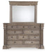 | Details | B916B4: Includes panel headboard, footboard with slats and rails, Made with hardwood solids, oak and ash veneer, cast resin components and engineered wood substrates, Tops with inlaid ash veneer border, Light warm grayish brown glazed wood finish, Breakfront pilasters, Inset picture frame panels, Headboard features light bridge with 2 overhead LED lights, Foundation/box spring required, sold separately , Mattress available, sold separately, Assembly required, B916B1: Includes dresser and mirror, Made with hardwood solids, oak and ash veneer, cast resin components and engineered wood substrates, Tops with inlaid ash veneer border, Light warm grayish brown glazed wood finish, Round metal knobs with satin nickel-tone finish, 10 drawers with fully finished interior, dovetail construction and ball-bearing side glides, Drawers with inset framed fronts, Dresser with breakfront pilasters, Mirror frame features light bridge with 2 mini LED lights, Mirror attaches to back of dresser, B916-46: Made with hardwood solids, oak and ash veneer, cast resin components and engineered wood substrates, Top with inlaid ash veneer border, Light warm grayish brown glazed wood finish, Round metal knobs with satin nickel-tone finish, 5 drawers with fully finished interior, dovetail construction and ball-bearing side glides, Drawers with inset framed fronts, Breakfront pilasters, B916-93: Made with hardwood solids, oak and ash veneer, cast resin components and engineered wood substrates, Top with inlaid ash veneer border, Light warm grayish brown glazed wood finish, Round metal knobs with satin nickel-tone finish, 3 drawers with fully finished interior, dovetail construction and ball-bearing side glides, Drawers with inset framed fronts, Breakfront pilasters, 110V power supply with dual USB charging ports, Power cord included; UL Listed, | |