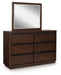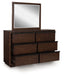 Casual contemporary styling with a decidedly modern vibe. This dresser with mirror is warm and inviting with a rich dark brown finish, adorning your restful retreat with on-trend elegance. Full-length metal pulls in a matte black finish add a subtly cool touch to spacious storage drawers. What a simply stunning way to achieve the bedroom of your dreams.