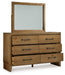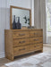 Details Includes dresser and mirror, Made with hardwood solids, mango wood veneer and MDF substrate, Light wood-tone finish, 6 smooth-gliding drawers with fully finished interior, dovetail construction and heavy duty ball-bearing side glides (top drawers felt lined) , Metal drawer pulls with darkened bronze-tone finish, Mirror attaches to back of dresser