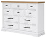 Casual style with substance. This two-tone dresser raises the bar on comfortably cozy design in your soothing sanctuary. A sturdy silhouette with a classic white finish and black metal hardware exudes modern farmhouse vibes. The butcher block oak veneer top adds a relaxed aesthetic. And this charmingly curated piece is spacious enough for all your essentials.