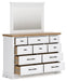 | Details | B844B4: Includes panel headboard, storage footboard, rails and roll slats, Footboard made with hardwood solids, MDF substrates and butcher block oak veneer, Headboard and rails made with hardwood solids and MDF substrates, White finish, Headboard with inset black metal barn sash, 2 drawers in footboard with fully finished interior, dovetail construction and ball-bearing side glides, Pulls with matte black finish, Bed does not require a foundation/box spring, Mattress available, sold separately, Assembly required, B844B1: Includes dresser and mirror, Made with hardwood solids, MDF substrates and butcher block oak veneer, Dresser with 2-tone finish (white finish; butcher block oak veneer with natural finish), Pulls with matte black finish, 10 spacious drawers with fully finished interiors (top drawers felt lined), dovetail construction and ball-bearing side glides , Drawers with inset picture fronts, Mirror attaches to back of dresser, B844-93: Made with hardwood solids, MDF substrates and butcher block oak veneer, 2-tone finish (white finish; butcher block oak veneer with natural finish), Pulls with matte black finish, 3 spacious drawers with fully finished interiors (top drawers felt lined), dovetail construction and ball-bearing side glides, 110V power supply with dual USB charging ports, Power cord included; UL Listed, Drawers with inset picture frame fronts, | |