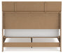 Clean-lined and contemporary—but far from stark—this bedroom package is a fresh style awakening. Pairing a light finish with replicated oak grain and textured beige details that replicate the look of cane, its mixed materials bring a naturally versatile vibe to your bedroom. Sleek, simple hardware plays perfectly with the modern aesthetic.