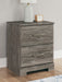 With its clean-lined look and modern attitude, this nightstand is a fresh style awakening. A warm gray hue over replicated oak grain easily complements other furniture finishes. Smooth drawer fronts with antiqued pewter-tone handles complete the aesthetic.