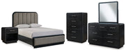 Rowanbeck Queen Upholstered Panel Bed with Mirrored Dresser, Chest and Nightstand