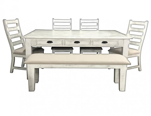 Split NickelFarmhouse style Dining Room set that is charming and elegant. Beautifully crafted with Solid Pine, this dining set has a weathered white finish t...