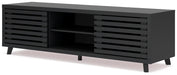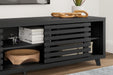 Entertain the art of modern living with this TV stand. Pairing a subtle wood grain look with a trend-right matte black finish, it’s beautifully in tune with your clean-lined design sensibility. Packed with potential, two sliding doors reveal even more adjustable shelving, just the ticket for storing your tech consoles, DVDs and games.