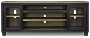 This TV stand with fireplace option is rustic, casual contemporary style simply done right. Its two-tone color scheme features a rich brushed black finish accented with a dusty grayish brown wood tone. With two glass-front cabinets (each with an adjustable shelf), an open cubby and a removable center shelf, it offers plenty of storage to house all of your electronic needs. Compatible with W100-12 electric LED fireplace insert (sold separately).