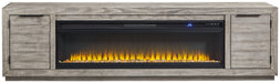 Balancing chic flair with a relaxed sensibility, this extra-large TV stand strikes just the right tone for rustic sophistication. Its beautifully clean lines are subtly enhanced with relaxed distressing and saw marks for authentic barn wood character. For your added viewing pleasure, the wide fireplace insert gives you the cozy feel of a fireplace without the added hassle. With the touch of a button, adjust the temperature and the color-changing flames, and set the timer for long-lasting enjoyment. It comes with faux glass crystals and natural stones, so you can customize the look of the flame bed.