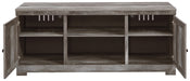 This TV stand with fireplace option is sure to win your heart with its daring designer take on modern rustic. The stand’s crisp, clean and minimalist-chic profile is enriched with a striking replicated oak grain with thick plank styling and a weathered gray finish for that much more authentic character. Crossbuck detailing adds a brilliant barn door inspired touch. Compatible with W100-101 and W100-02 electric fireplace inserts, sold separately.