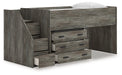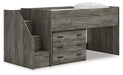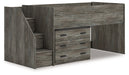 Details Includes loft bed, left storage steps with loft ends, roll slats and loft drawer storage, Made with engineered wood (MDF/particleboard/plywood) and decorative laminate for the right balance of affordability and durability, Rustic warm gray finish over replicated oak grain with authentic touch, Decorative laminate replicates natural or man-made material surfaces with consistent color, pattern and texture, 3 smooth-gliding storage drawers, Bed does not require additional foundation/box spring, Mattress available, sold separately, Assembly required