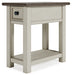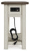 | Details | Made of wood, white oak veneers and engineered wood, Two-tone (weathered gray and antique white) finish, Chairside end table features plank-styled top, Smooth-gliding drawer perfect for holding remotes and more, Integrated 110V power supply with dual USB charging ports, Black faceted hardware, Assembly required | |