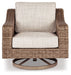 | Details | All-weather resin wicker handwoven over powder coated rust-proof aluminum frame, Zippered cushions covered in high-performing Nuvella® fabric, All-weather foam cushion core wrapped in soft polyester, 360-degree swivel, Imported fabric and fill, Clean fabric with mild soap and water, let air dry; for stubborn stains, use a solution of 4 oz. bleach to 28 oz. water, Assembly required | |