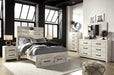 Details B192-46: Made of engineered wood (MDF/particleboard) and decorative laminate, Wispy white finish over replicated oak grain with authentic touch, Large-scale hardware with dark finish, 5 smooth-gliding drawers, Drawer interiors are lined with a faux linen laminate for a clean, finished look, Safety is a top priority, clothing storage units are designed to meet the most current standard for stability, ASTM F 2057 (ASTM International), Drawers extend out to accommodate maximum access to drawer interior while maintaining safety, B192-92: Made of engineered wood (MDF/particleboard) and decorative laminate, Wispy white finish over replicated oak grain with authentic touch, Large-scale hardware with dark finish, 2 smooth-gliding drawers, Drawers lined with faux linen laminate for finished aesthetic, 2 slim-profile USB charging stations, Power cord included; UL Listed, B192B1: Includes dresser with mirror, Made of engineered wood (MDF/particleboard) and decorative laminate, Wispy white finish over replicated oak grain with authentic touch, 6 smooth-gliding drawers, Drawer interiors are lined with a faux linen laminate for a clean, finished look, Large-scale hardware with dark finish, Mirror attaches to back of dresser, Assembly required, B192B34: Includes headboard, footboard, side storage, rails and slats, Made of engineered wood (MDF/particleboard) and decorative laminate, Wispy white finish over replicated oak grain with authentic touch, Large-scale hardware with dark finish, Decorative sconce light, LED with 3 AA batteries, 4 smooth-gliding storage drawers, 4 storage cubbies, 2 slim-profile USB charging ports, Power cord included; UL-listed, Bed does not require additional foundation/box spring; accommodates most zero clearance adjustable bases with the addition of a bunkie board, Mattress available, sold separately, Assembly required,