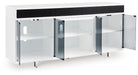 Combining a white high-gloss finish with black glass doors, this TV stand proves opposites really do attract. It's the perfect blend of modern style and functionality, with an electric fireplace option and ample space for your media devices, flat-screen TV and soundbar. What a smart choice on so many levels.