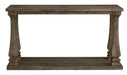 Homey. Hearty. Heavenly hued. Luring with a distressed weathered gray finish and square baluster legs set on a broad lower shelf for great presence, this sofa table is sure to make your homestead feel that much more like home. The look is beautified with elm veneers and a framed and plank-effect tabletop for a richly crafted masterpiece made for years of satisfaction.