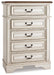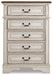 Elevating the art of traditional cottage styling, this chest of drawers is your dream bedroom retreat realized. Its antiqued two-tone aesthetic blends a chipped white with a distressed wood finished top for added charm. Framed drawer fronts and decorative corbels add refinement, while bail pulls in a dark bronze-tone finish lend a classic touch.
