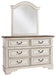 Elevating the art of traditional cottage styling, this dresser and mirror set is your dream bedroom retreat realized. This brilliantly crafted bedroom ensemble wows with dramatic scalloped details and an antiqued two-tone aesthetic, blending a chipped white with a distressed wood finished top for added charm. Framed drawer fronts and decorative corbels add refinement, while bail pulls in a dark bronze-tone finish lend a classic touch.