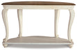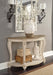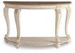 Elevating the art of traditional cottage styling, this demilune sofa table is sure to serve you beautifully for years to come. Antiqued two-tone aesthetic blends a chipped white with a distressed wood finished top for added charm. Classic cabriole legs and shapely lower shelf are a lovely twist. Decorative corbels add refinement.