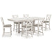 Details D642-32: Made with rubberwood solids, ash veneer and MDF substrates, Antiqued white finish with wood grain texture, Tabletop with planked effect, Two 12” extension leaves, Table extends by pulling both ends and dropping in leaf, Assembly required, D642-124: Made with wood, Antiqued white finish with wood grain texture, Foam cushion with polyester upholstery, Nailhead trim, X-back, Assembly required,