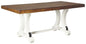 A high-style choice for casual spaces, this dining table serves up the best in rustic farmhouse living. Its two-tone distressed finish pairs a brown tabletop with a vintage white base for a double helping of charm. This extension dining table features an extra thick edge with book matched inlay veneer for a distinctive twist.